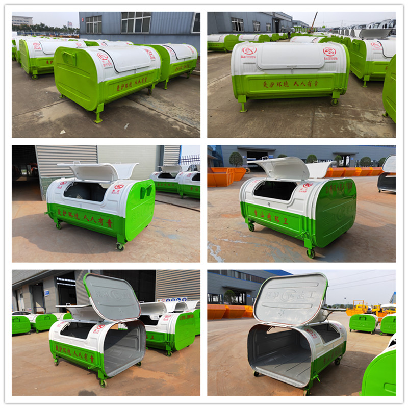 勾臂垃圾車配套移動垃圾箱外形以上梯形下長方形、上弧形下長方形、上弧形下弧形、長方形為主,箱體兩邊各帶一對或二對垃圾投入口或頂部開口,帶蓋式箱體能夠避免風(fēng)將輕質(zhì)垃圾(塑料袋,廢紙等)吹散和防止雨水進(jìn)入箱內(nèi);箱體底部帶一對鐵輪方便吊上卸下時垃圾箱的移動,箱體后部可開啟【帶鎖緊機(jī)構(gòu),配備密封條】。勾臂垃圾箱外觀形狀、大小容積可根據(jù)用戶需求定制加工。