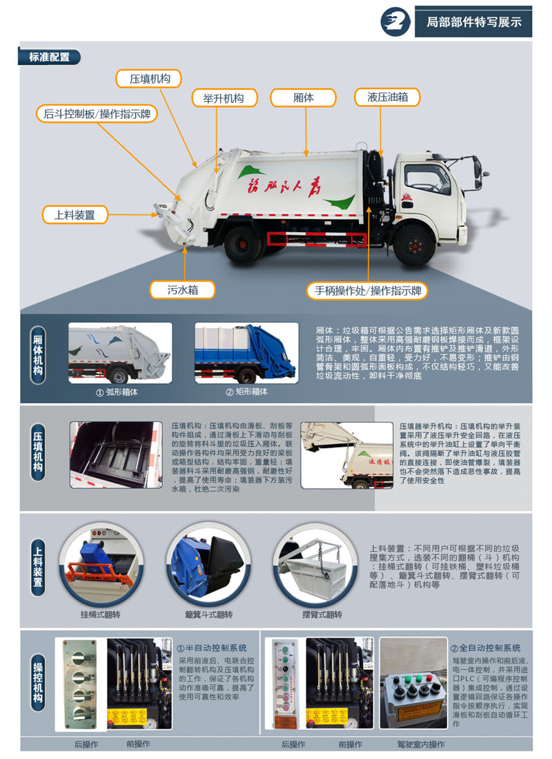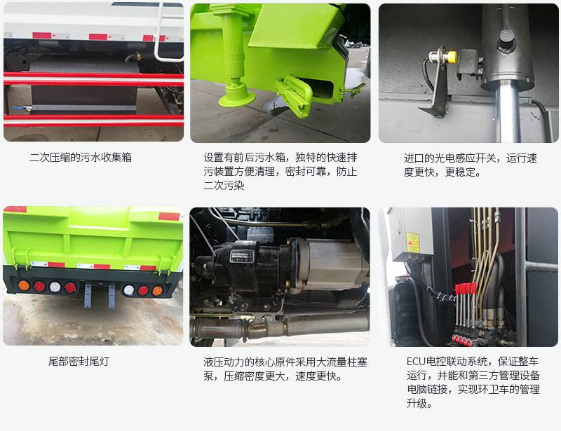 上裝配置:廂體圓弧設(shè)計(jì)(增強(qiáng)廂體承受力),Q345錳鋼板(高強(qiáng)度耐磨抗壓材質(zhì),罐體試用壽命更長),前后雙向壓縮,推鏟卸料,長源液壓泵,中梅多路換向閥,維森博樂油缸,高耐壓液壓油管,西門子PLC一鍵操作系統(tǒng)(駕駛室內(nèi)外均可操作),移動遙控器控制箱體操作,雙污水箱(前后各一個(gè)),邊燈,高位示廓燈,夜間作業(yè)燈。